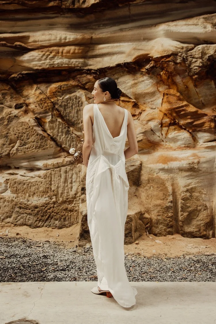 “For my Upcycling Challenge entry, I am using many small offcuts of my own and that of another local bridal brand to create a customer fabric, pieced together from many skills. This bridal design is multiwear and multisize and finished with hand rolled hemlines.”